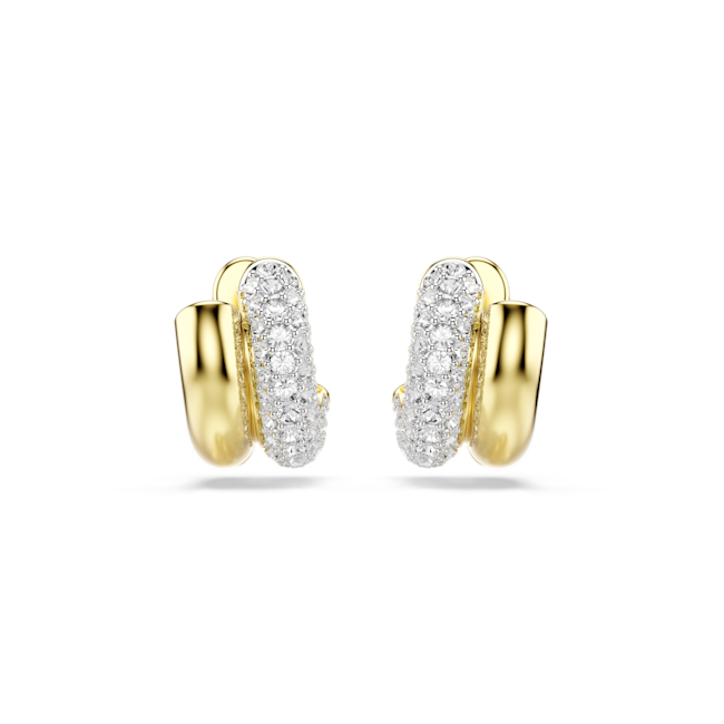 Embodying the industrial style of Dextera, these tubular earrings combine a gleaming gold-tone plated surface with a pavé of clear crystals on one side. An additional spring plate mechanism ensures each piece is easy to take on and off. Wear these mini hoops as a distinctive choice for your day to night styling.