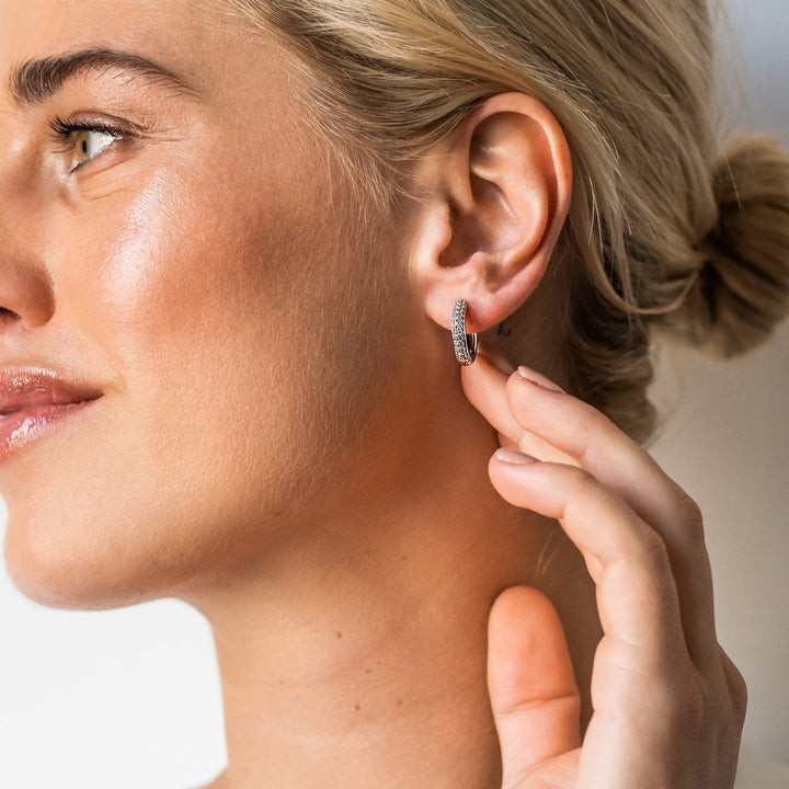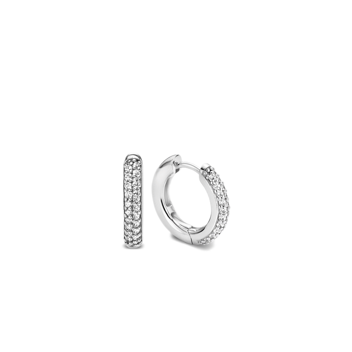 These TI SENTO earrings each have a diameter of 18 mm, and are made from quality rhodium plated sterling silver; they have been designed with two rows of brilliant, neatly-cut cubic zirconias, which have themselves been placed in a channel setting that dominates the front view of the earrings when worn. Here at TI SENTO, we recommend wearing these earrings together with ear charms, though they dazzle all by themselves just as nicely.