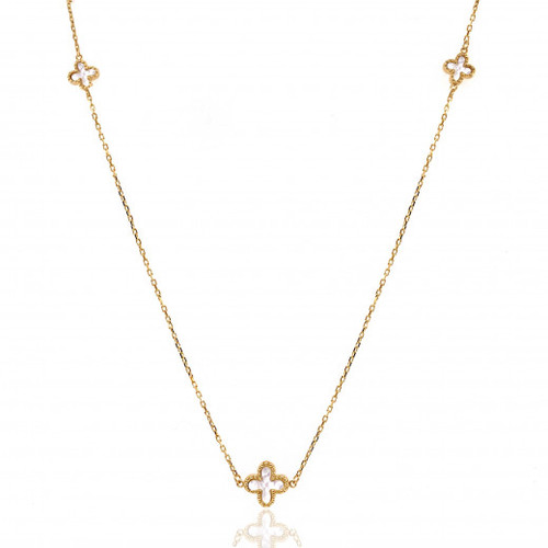 9ct Yellow Gold Set comprising of Necklace, Bracelet and Earrings dotted with iridescent white Mother of Pearl stylised crosses. Each cross is surrounded by a gold bead effect adding an attractive and enhancing detail.This Necklace has a medium sized cross as it's centrepiece with a further 2 more smaller crosses, one either side of the middle cross.