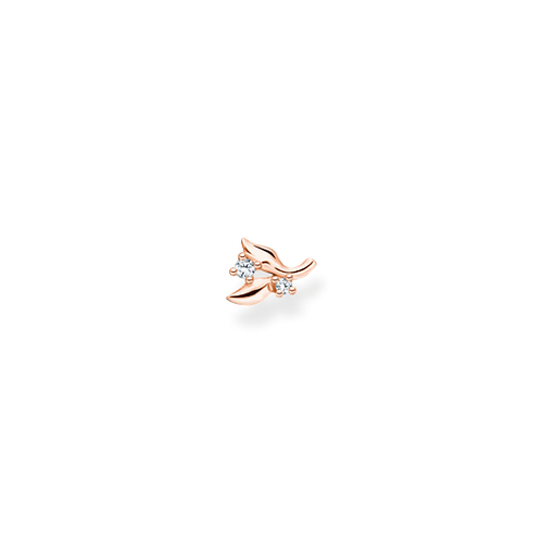Charming piece of jewellery: This filigree single ear stud impresses with its design that is inspired by nature. It’s made from high-quality 925 Sterling silver with rosé gold-plating and decorated with two rounded sparkling white zirconia stones. Thanks to them and the finely finalised leaves, the single ear studs’ design looks like a tendril with tiny blossoms. It’s perfectly suitable for creating stylish Ear-Candy-Looks together with ear-cuffs and hoop earrings.
