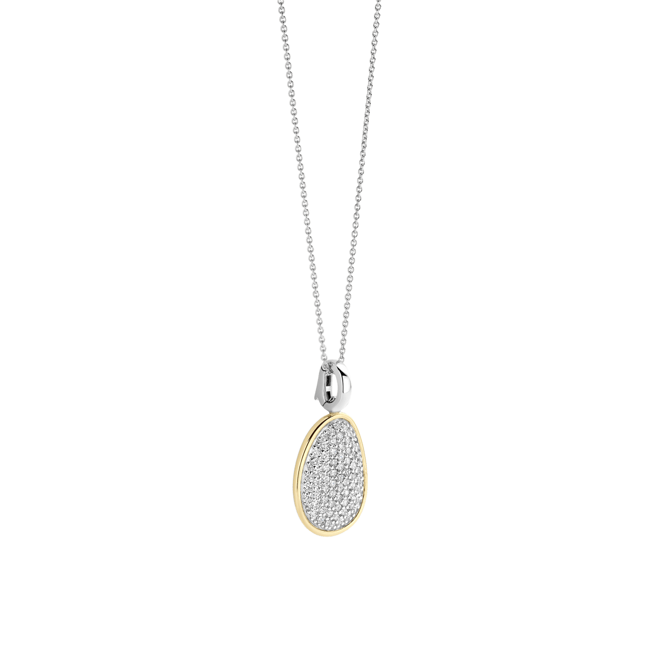 Discover refined radiance with this TI SENTO gold-plated silver Pendant 6847ZY. Crafted from 925 sterling silver, its pebble-shaped drop is entirely pavé-set with brilliant white cubic zirconia that shimmer like a pool of light. A warm yellow-gold rim traces the organic contour, while the sleek platinum-plated bail attaches to a delicate silver chain. Wear it solo for statement shine, or layer it with shorter necklaces to curate a personalised stack rich in texture and tone. Designed for sensitive skin, it is nickel-free and hypoallergenic, ensuring effortless comfort and enduring quality. The pendant comes with a dainty silver chain necklace.