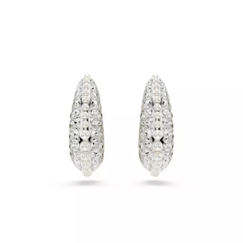 A spellbinding piece of jewelry offering intense radiance. These rhodium plated pierced earrings are crafted with a domed metal base for sensational volume and adorned with a strip of white Swarovski Crystal Pearls and a pavé of clear crystals. The overall effect is beautifully bold and inspires endless styling possibilities when accompanied by other Sublima pieces.
