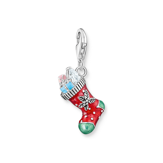 What did Santa bring you? This charm made of recycled silver in the shape of a three-dimensional Christmas sock will reveal it. It is hand-painted with red, green, blue and soft pink cold enamel and it is filled with a gift, a sugar cane and a sparkling white zirconia stone. The Christmas sock is elaborately embellished with a dot pattern, a stylized mistletoe and a pendant with a small, white zirconia stone. Spread a little Christmas cheer on your charm bracelet or charm necklace.