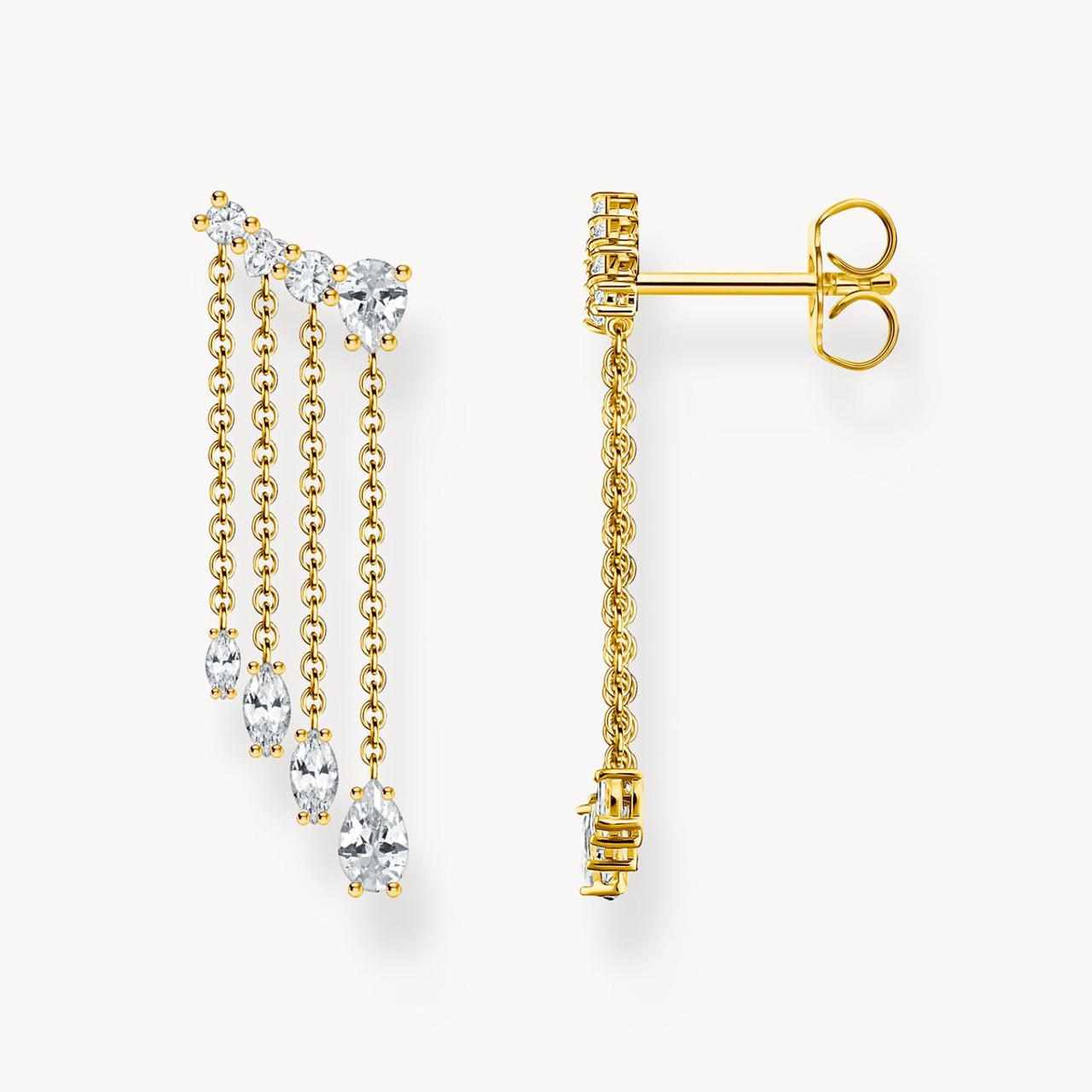 The perfect piece of ear jewellery for many occasions and looks: these extraordinary waterfall earrings are made of recycled silver and are refined with 18k gold plating. They are produced sustainably and with great care, and are set with white zirconia stones. The latter are lined up on the stud in different sizes and with different, elaborate cuts, and swing lightly on delicate chains with every movement. These playful, gold-coloured earrings are your perfect accessory for statement looks as well as glamorous events.